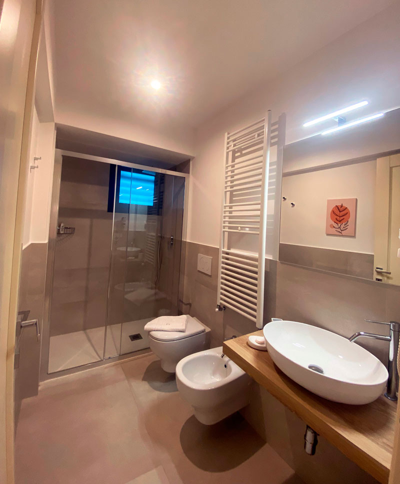 L'angolo living con divano all'occorrenza può diventare anche un posto letto, mentre la “romantica” camera matrimoniale gode di un'ampia finestra che dà sulla corte interna.