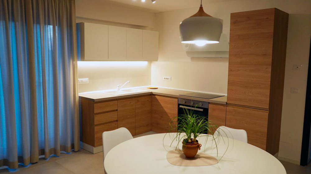 Il nostro appartamento tipo mansarda è di circa mq. 40 ed è ideale per coppie che voglio godersi la loro riservatezza e rilassarsi sull'ampio terrazzo dal quale si vede il mare. L'accogliente soggiorno che dà sul terrazzo ha un comodo angolo cottura con piastra ad induzione a quattro fuochi, frigo grande con congelatore, forno elettrico e lavastoviglie.